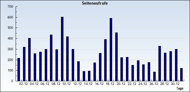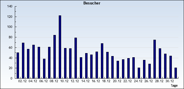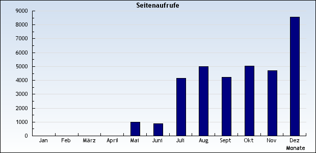 Die Zugriffszahlen werden leider von unserem Zähler nicht so gesehen: Allein im November und Dezember kommen schon mehr Besucher zusammen, als es der Zähler anzeigt. Und der zählt immerhin schon seit Oktober 2006! Als Besucher wird jeder gezählt, der auf unsere Seite zugreift und nicht bereits vorher als Besucher erfasst wurde. D.h.: Eine bestimmte IP-Adresse wird erst nach einer bestimmten Zeit wieder als neuer Besucher gezählt.