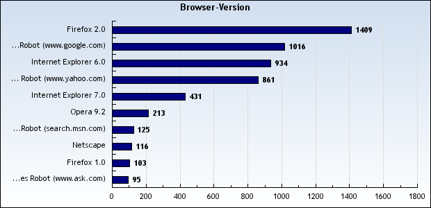 Die Bilanz wird allerdings etwas durch den Besuch von sogenannten Robots beschönigt. Dies sind automatisierte Programme, ähnlich einem Webbrowser, die unsere Seite im Auftrag von Google, Yahoo oder anderen Suchdiensten besuchen. Eine Idee davon, wieviel das ausmacht, bekommt man durch einen Blick auf die Auflistung der beim Besuch unserer Seite eingesetzten Browser.