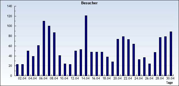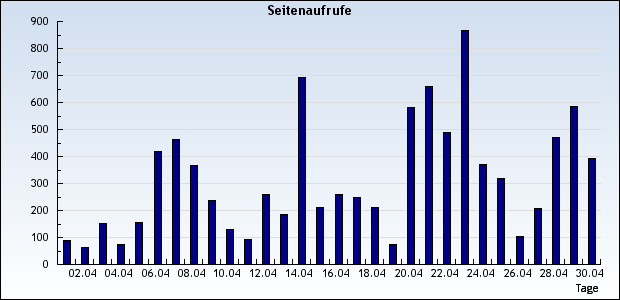 Am Verlauf der Besucherzahlen und Seitenzugriffe im April kann man gut erkennen, dass jeweils nach dem Tag der Entscheidung in der Bezirkssklasse (das war der 13.04.2008) und nach der Begegnung gegen Rodalben (die Enscheidung in der 2. Pfalzliga am 06.04.2008) ein Anstieg zu verzeichnen war, der über den an einem Wochenende normalen hinaus ging. Offenbar wird unsere Seite als Informationsquelle über unseren Bezirk hinaus gut angenommen ...