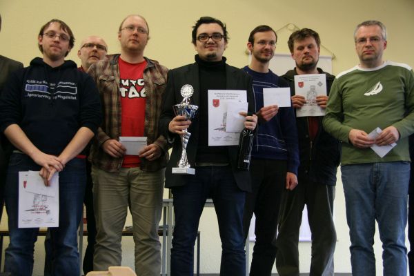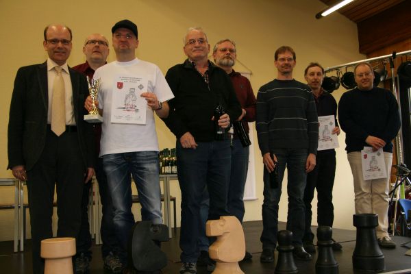 Nachdem Volker im Hauptturnier I mit 1,5 Punkten aus 3 Partien mühsam begann, gelangen ihm anschließend drei Siege in Folge. Das katapultierte ihn vor der finalen Runde in das Führungsquartett, die daraufhin den Sieg unter sich auskämpften. Volker musste mit Schwarz an Brett 1 gegen den Favoriten CM Markus Müller antreten. Mit einem Unterschied von 400 DWZ-Punkten verlief der Kampf dann auch dementsprechend einseitig. Nachteile in der Eröffnung und im Mittelspiel versuchte Volker durch jeweils ein Bauernopfer wettzumachen, was aber letztlich nur zu einem verlorenen Turmendspiel führte. Durch die Niederlage rutschte Volker zwar auf Platz 6 ab, gewann jedoch den Rating-Preis bis 1700 DWZ.