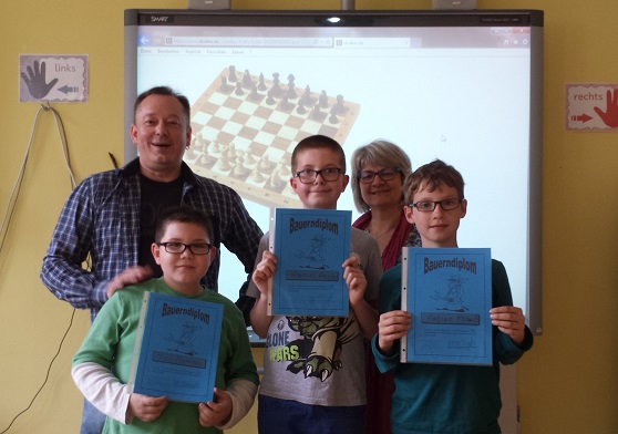 An der Grundschule Niederkirchen konnten zum Schuljahresende an drei Schüler der Schach-AG die Bauerndiplome überreicht werden. Die Schüler haben im vergangenen Jahr an der wöchentlichen Schach-AG der Grundschule teilgenommen und mit der erfolgreich abgelegten Prüfung gezeigt, dass sie neben den Regeln des Königlichen Spiels schon weitere Grundlagen beherrschen. Die Rektorin der Grundschule, Christine Gauer, und der Betreuer der Schach-AG, Frank Götz vom Schachclub Niederkirchen, betonten, dass das Schachspiel das logische Denkvermögen und die Charakterbildung der Schüler fördert.