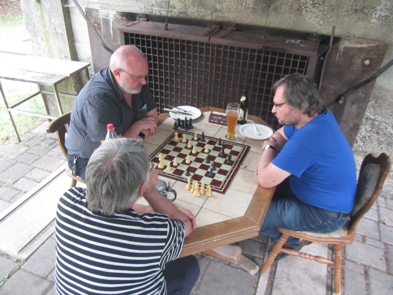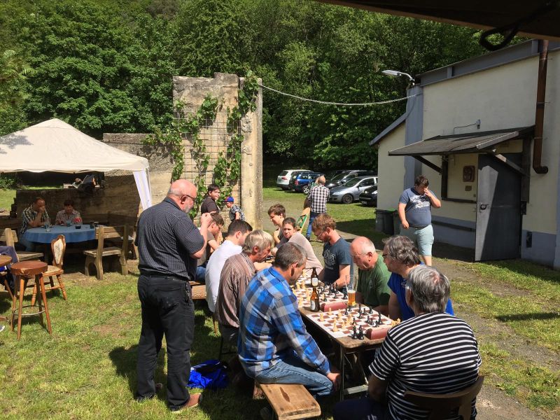 Über 50 Spieler und Angehörige, Jugendliche mit Familie, Freunde und Gönner und auch ein paar Schachfreude aus Wolfstein, fanden den Weg bei angenehm mildem Wetter. Wie immer lag ein Schwerpunkt beim Schachspielen (Alt gegen Alt, Jung gegen Jung, und natürlich auch Jung gegen Alt). Dazu gab es noch Wickinger-Schach, Lagerfeuer-Romantik und den Grillmeister Klaus zu bestaunen, der jedem Schwenker das Brandzeichen der Motorradfreunde Niederkirchen einbrandte.